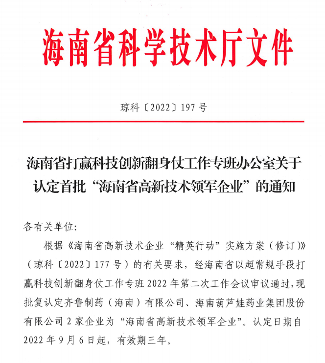近日,海南省科学技术厅发布的《海南省打赢科技创新翻身仗工作专班办公室关于认定首批“海南省高新技术领军企业”的通知》中显示,批复认定海南DG视讯药业集团股份有限公司等2家企业为“海南省高新技术领军企业”。认定日期自2022年9月6日起,有效期三年。