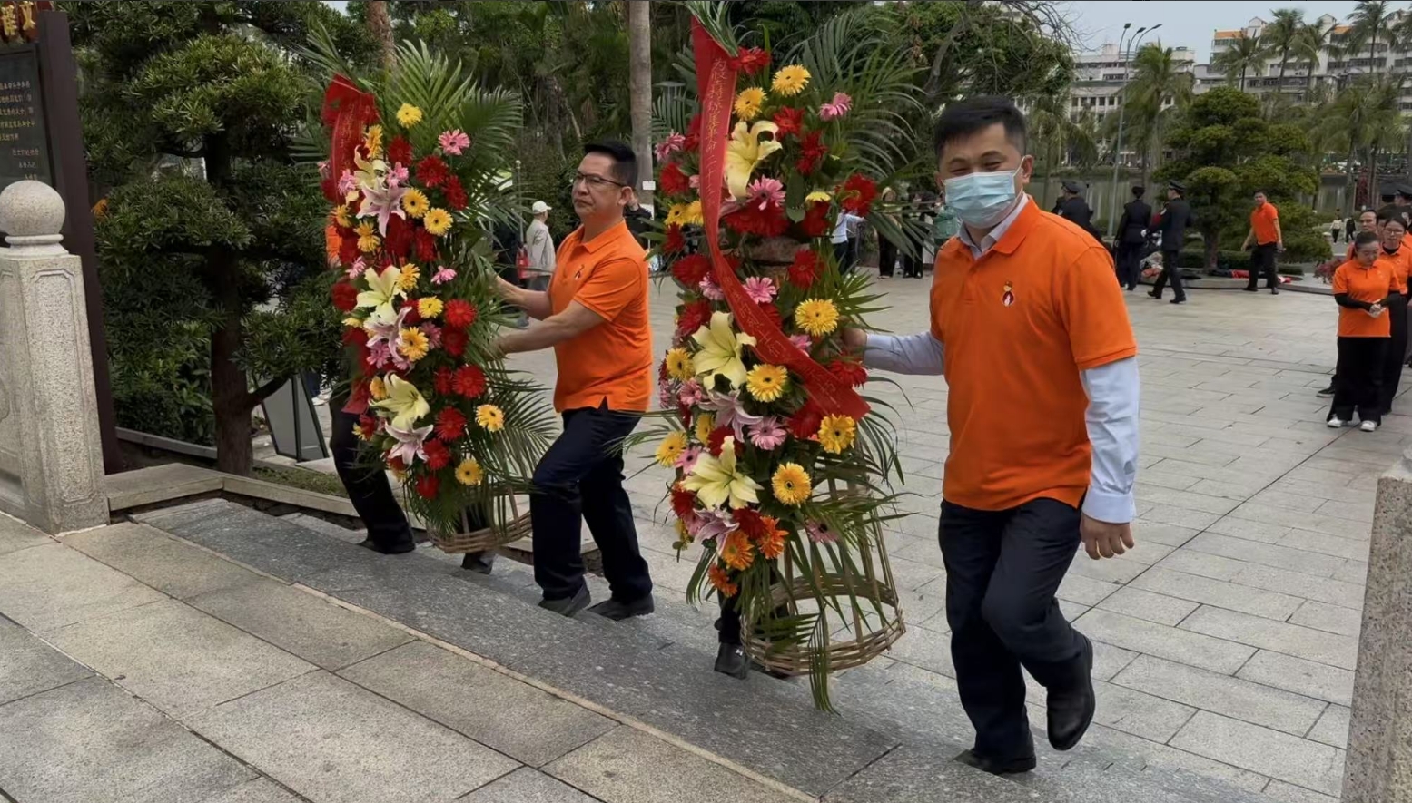 经过一段时间的等待才轮到DG视讯。DG视讯首先向烈士敬献花篮,花篮缎带上写着“为坚持琼崖革命23年红旗不倒牺牲的烈士们永垂不朽!”“为解放海南岛渡海牺牲的烈士们永垂不朽!”鲜艳的花篮寄托DG视讯对革命先辈的崇敬和哀思。